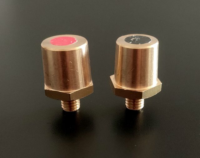 Detalles del productoConectores para batería, dos unidades en total. Son de latón en color dorado y tienen una pequeña marca roja (positivo) y negra (negativo)en la parte superior