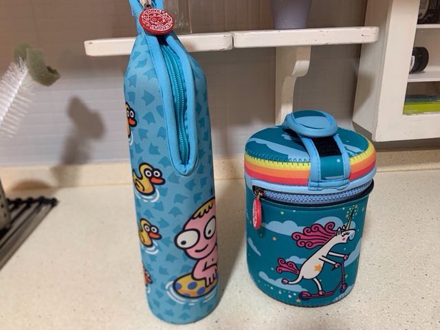 - Termo para sólidos (1 litro) con cierre hermético, fabricado en acero inoxidable. Añade funda de neopreno con divertido diseño de Katuki Saguyaki (unicornio patinando). Contiene dos contenedores (375 ml y 250 ml).