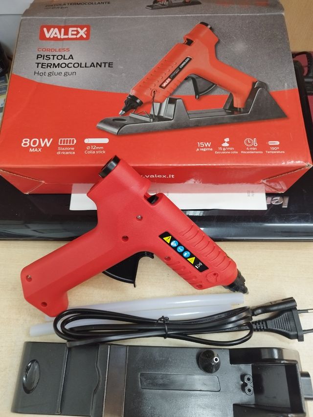 Termosellante de silicona caliente inalámbrica con barras de silicona y cargador y dos salidas de silicona.