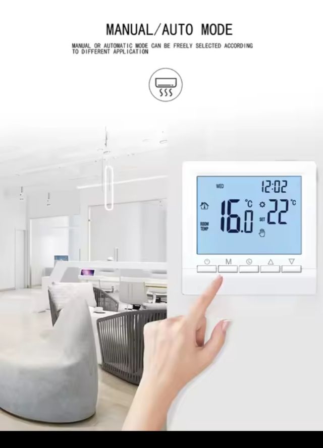 Detalles del productoTermostato digital con modos manual y automático seleccionables.