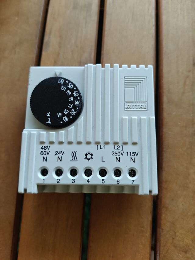Termostato Rittal en buen estado. - Permite regular la temperatura. - Dispone de una escala graduada. - Incluye conexiones para diferentes voltajes.