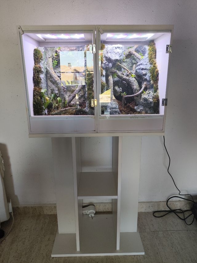 Detalles del productoSe venden dos terrario de PVC con puerta abatible de medidas 30x30x42cm (Largo, fondo y Alto) con fondo decorativo y ventilación de malla en la parte superior, incluye mesa blanca en perfectas condiciones .