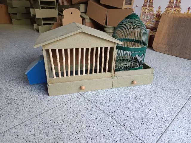 Terrero de madera con jaula verde y comedero. - Estructura principal de madera con barrotes. - Jaula redonda de color verde. - Comedero integrado con cajones.