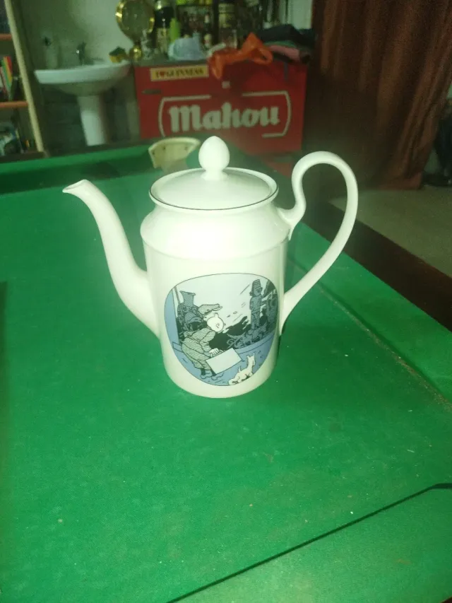 Detalles del productoTetera de porcelana blanca con un diseño inspirado en Tintín. Presenta una ilustración detallada en su cuerpo.