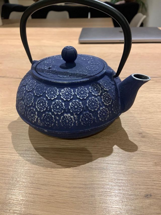 Tetera de hierro forjado azul con diseño floral