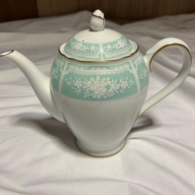 Elegante tetera de porcelana con un delicado diseño floral en tonos verdes y blancos. - Borde y detalles en dorado. - Tapa a juego con un pequeño pomo. - Asa ergonómica.