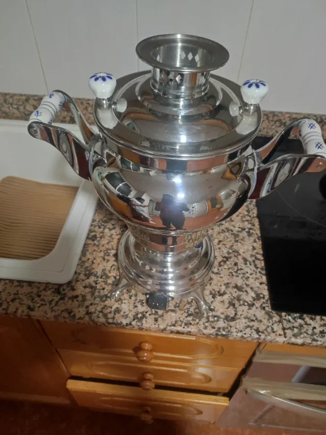 Tetera eléctrica con un acabado plateado brillante y detalles decorativos en blanco y azul en las asas y tapas.