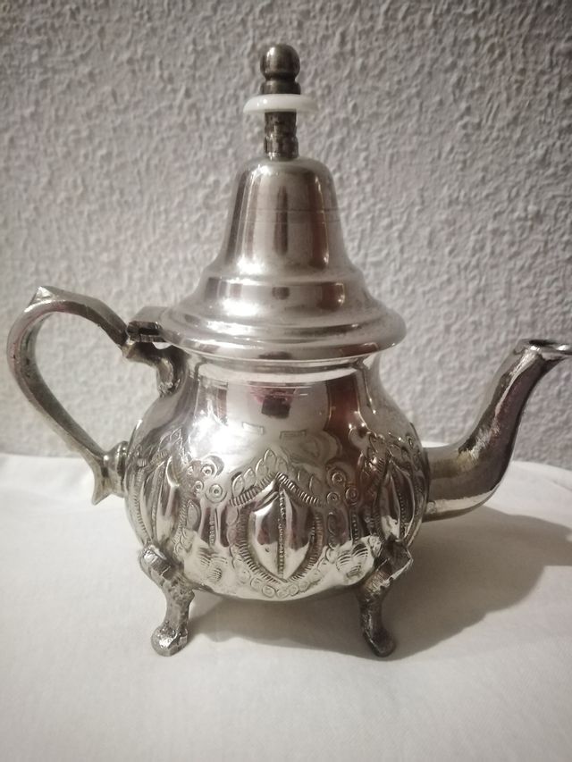 NuevoDetalles del productoElegante tetera de estilo marroquí, con un diseño intrincado y detalles ornamentales. Comprada en Marruecos.