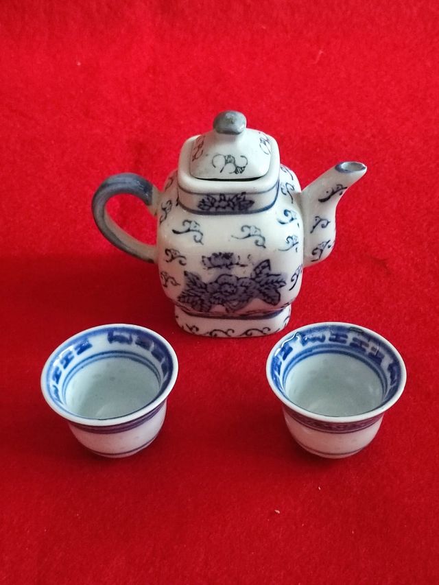 Buen estadoDetalles del productoConjunto de tetera y dos vasitos de porcelana con un bonito diseño.
