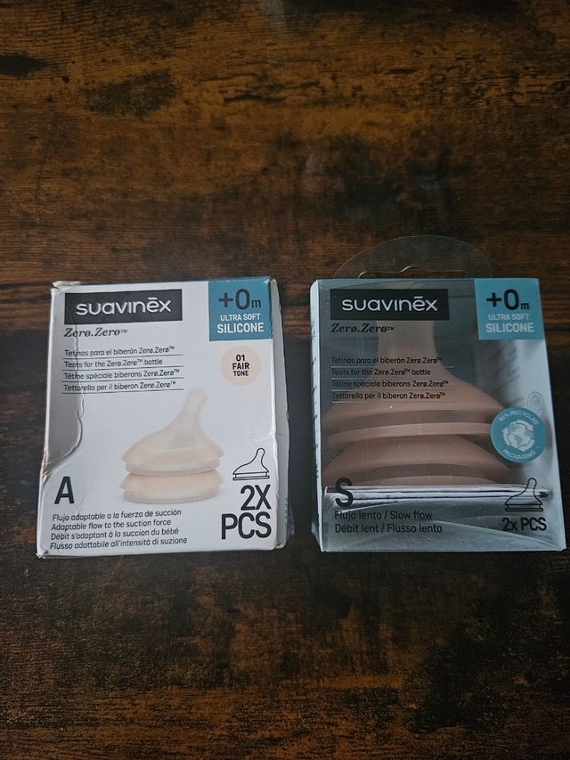 Detalles del productoVendo dos paquetes de tetinas Suavinex Zero.Zero para recién nacidos. Son de silicona ultra suave y vienen en dos tamaños: flujo adaptable (A) y flujo lento (S). Cada paquete incluye dos tetinas. Están nuevas sin usar.