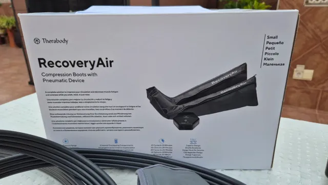 Detalles del productoBotas de compresión Therabody RecoveryAir en talla S. Diseñadas para mejorar la circulación y reducir la fatiga muscular.