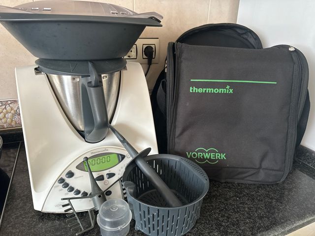 Detalles del productoRobot de cocina Thermomix T31 en color blanco. Incluye varios accesorios y una bolsa de transporte.