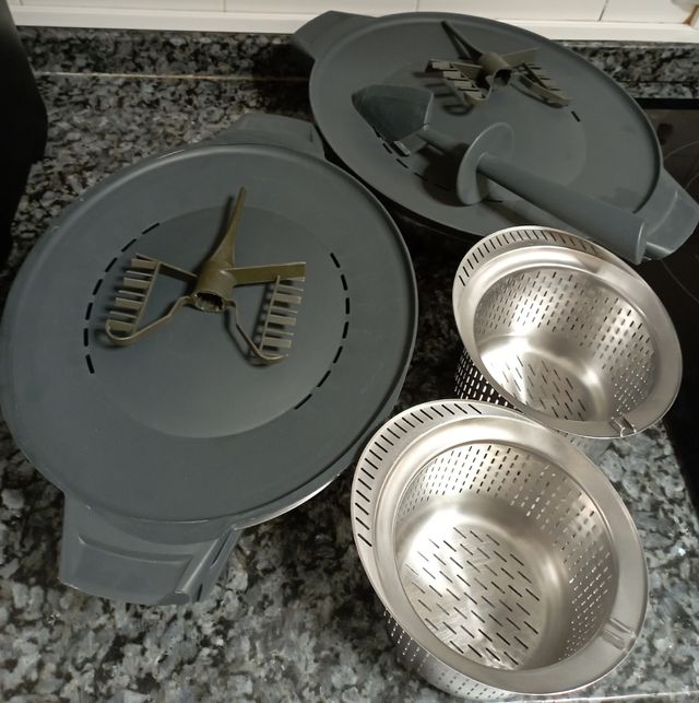 Thermomix tm21 para piezas. La cuchilla da problemas ( suelta virutas). No funciona el peso. Las varomas, cestillos y la bandeja con rejilla no se ha usado nunca.