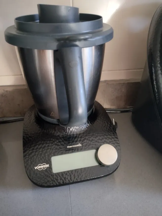 Robot de cocina Thermomix de la marca Vorwerk. Diseño moderno en color negro con detalles texturizados. - Pantalla digital. - Botón selector circular.