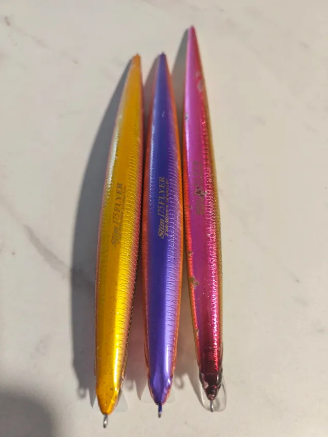 Tres señuelos de pesca TIDE MINNOW 175 Y 200 FLYER en colores dorado, morado y rosa.
