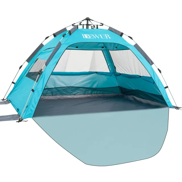 Detalles del productoTienda de campaña azul, ideal para 2 a 4 personas. Cuenta con un suelo extendido para mayor comodidad.