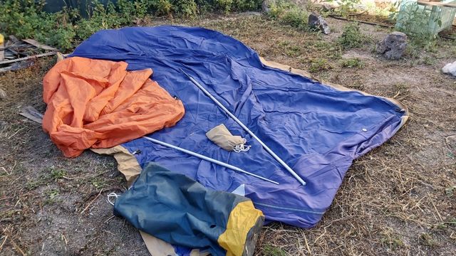 Detalles del productoTienda de campaña canadiense de los años 80 con suelo y doble techo de nilon. Está completa. La funda tiene alguna rasgadura. La tienda y el doble techo están bien. La tienda es como la de la última foto, pero con la lona azul y el doble techo naranja. Entrega en mano Madrid <-> Cáceres Medidas del producto