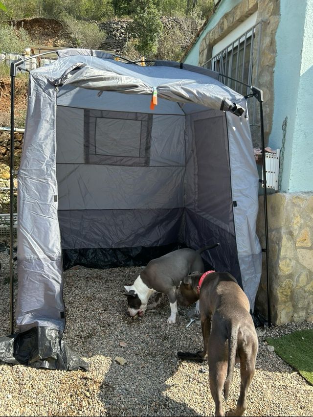 Tienda de campaña de color gris, ideal para exteriores. - Estructura de metal. - Ventana de malla. - Fácil de montar. Anchura: 185cm Profundidad: 185cm Altura: 200cm