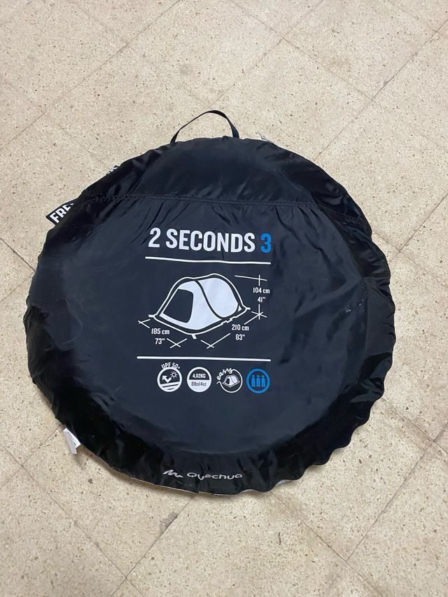 Detalles del productoTienda de campaña Quechua modelo 2 Seconds 3, diseñada para 3 personas. Es compacta y fácil de transportar.