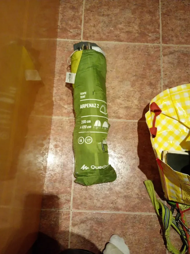 Tienda de campaña Quechua Arpenaz 2 para 2 personas. Es ligera y fácil de transportar. - Peso: 2.4 kg. - Dimensiones: 200 cm x 120 cm.