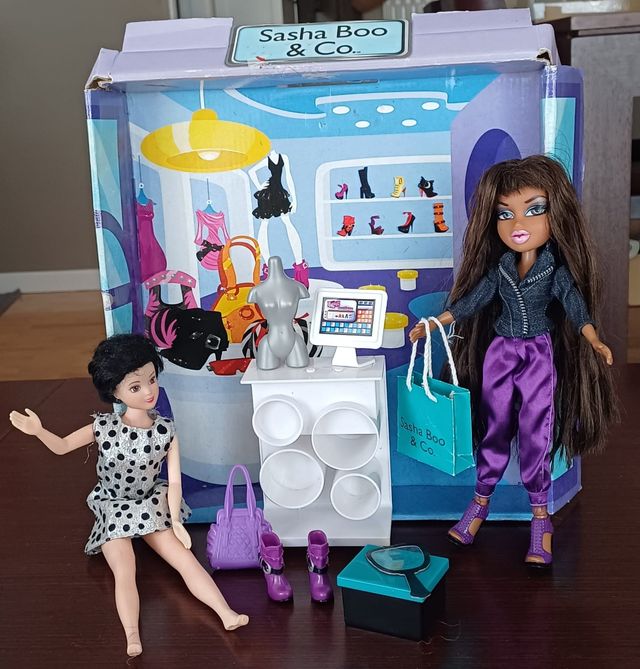 Detalles del productoSet de juego de tienda de moda Sasha Boo & Co. con una muñeca.