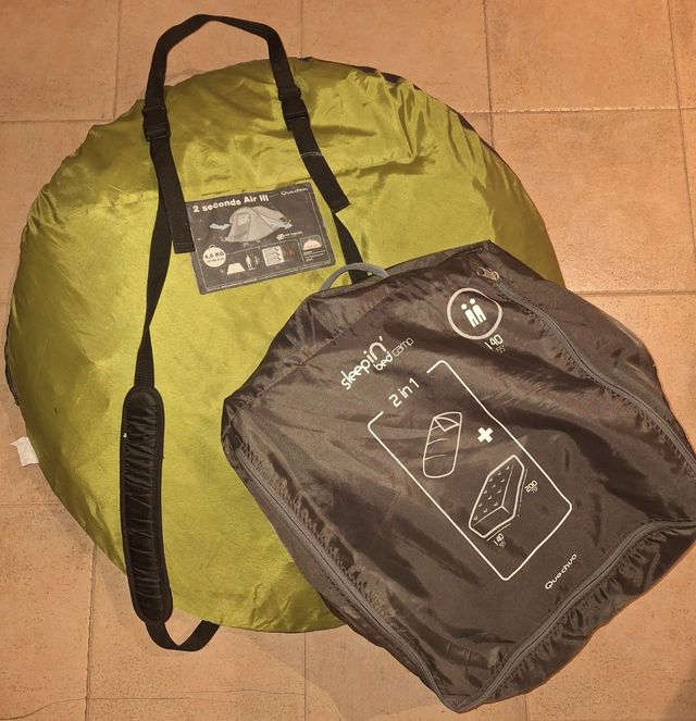 Detalles del productoConjunto de tienda de campaña y saco de dormir/colchón de la marca Quechua.