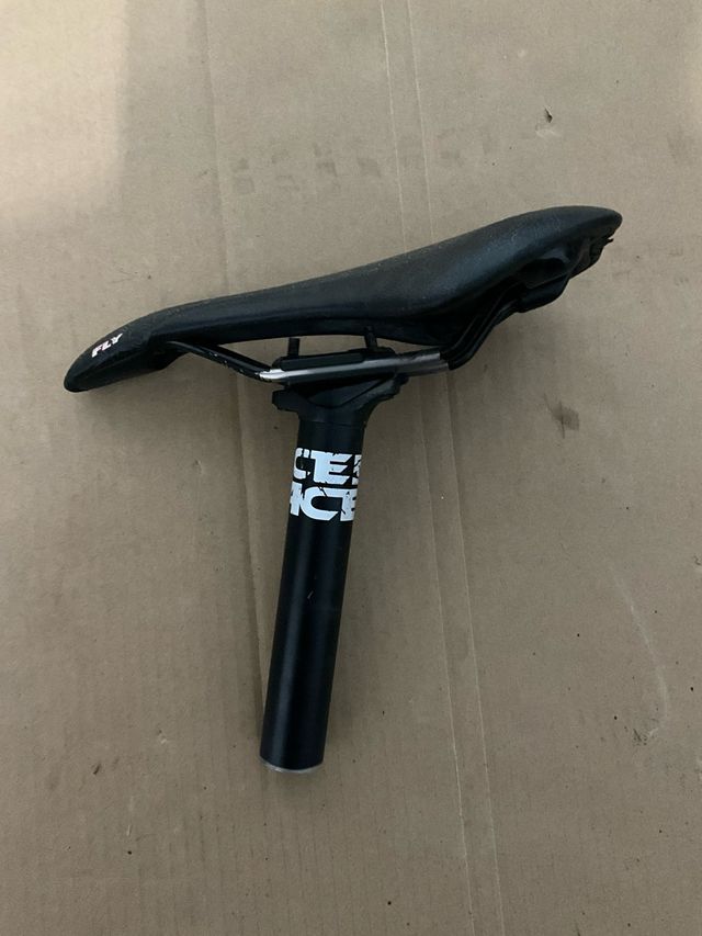 Conjunto de tija y sillín para bicicleta. - Sillín negro marca i-FLY ti - Tija negra Race face 30.9 descenso enduro dh downhill Burgtec
