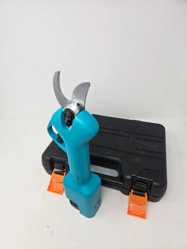 Detalles del productoTijera de podar eléctrica con batería recargable y su maletín de transporte.