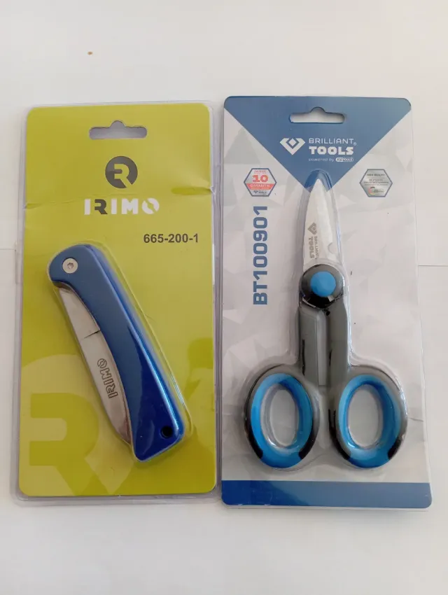 Set de herramientas para electricista que incluye una tijera y una navaja. - Tijera inox con mangos de plástico azul y negro. - Navaja con mango azul y hoja plegable.