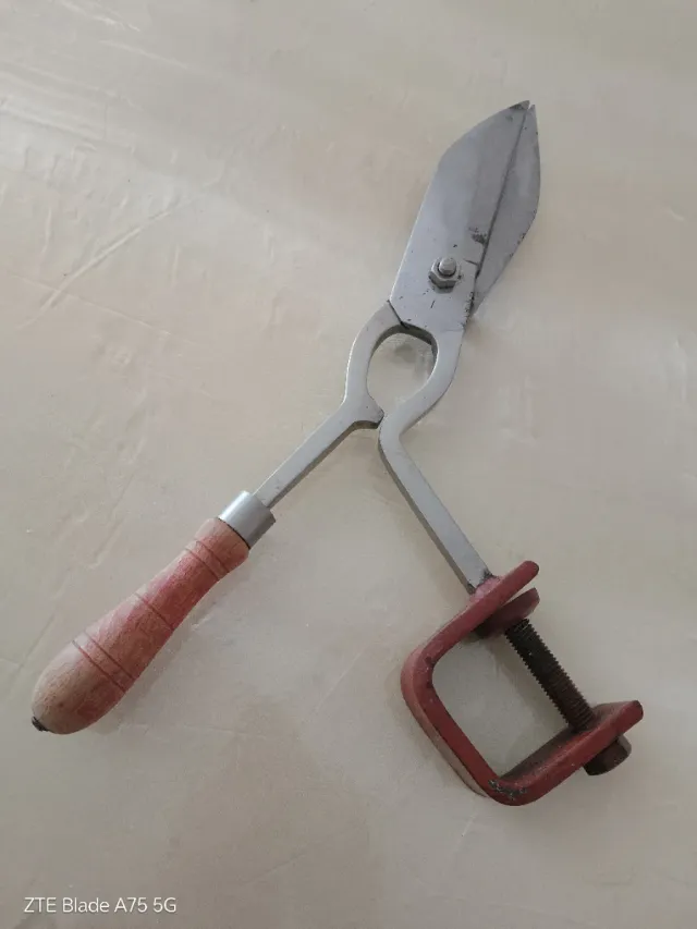 Tijeras de podar con mango de madera y sargento para fijación. Hojas de metal, el mango es de madera con detalles. Sargento de metal rojo.