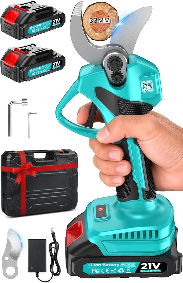 Detalles del productoTijeras de podar eléctricas nuevas. Motor sin escobillas de 1000W potente y duradero. Capacidad de corte en 2 niveles: 25mm para ramas delgadas y 33mm para ramas gruesas. Incluye 2 baterías de litio de 21V y 2000mAh con 4-6 horas de autonomía cada una. Cargador rápido que recarga en 2-3 horas. Pantalla LCD que muestra nivel de batería y contador de cortes. Cuchillas de acero SK7 tratadas térmicamente, muy resistentes y duraderas. Incluye cuchilla de repuesto. Diseño ligero de solo 0.7kg con mango ergonómico antideslizante. Sistema de seguridad triple. Kit completo con 2 baterías, cargador, cuchilla extra, llaves hexagonales y estuch