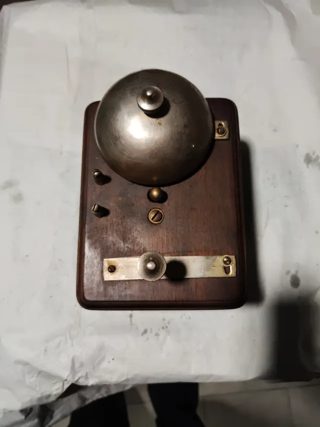 Pieza antigua de timbre con base de madera y campana de metal. - Base de madera oscura. - Campana metálica. - Mecanismo visible con tornillos.