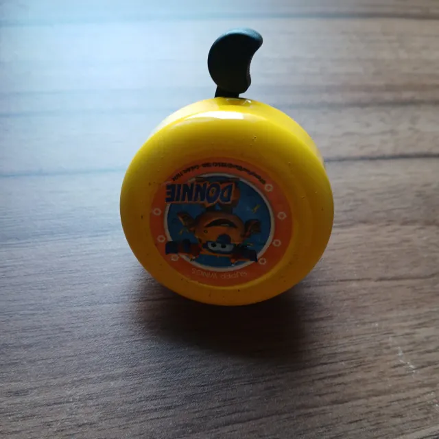 Timbre amarillo para bicicleta infantil con diseño de Donnie de Super Wings. Está un poco usada pero nada notorio, escucho ofertas.