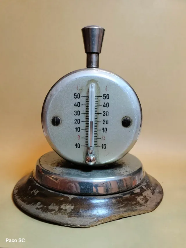 Detalles del productoTimbre llamador antiguo E.S. SEBAR, de los años 40-50. Cuerpo metálico cromado con base de madera y termómetro funcional. Timbre mecánico con pulsador superior. En buen estado, con pátina y señales de uso propias del tiempo. Ideal para decoración vintage, coleccionistas o mostradores retro. Pieza original y difícil de encontrar. 📏 Medidas aproximadas: 12 cm de alto x 9 cm de diámetro de la esfera.