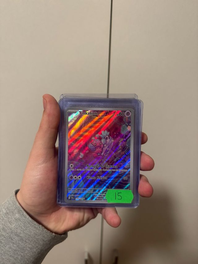 Carta de Pokémon Tinkatink, edición Pal en español. La carta presenta un diseño brillante y detallado. - Tipo: Tinkatink - Idioma: Español - Edición: Pal