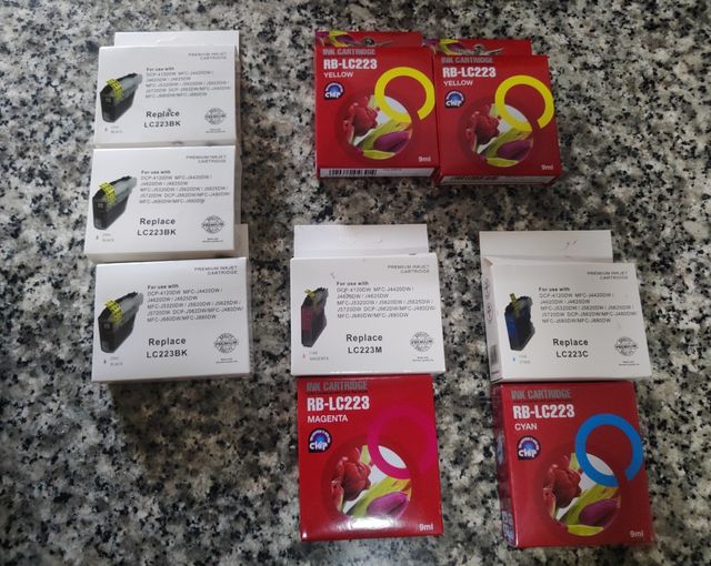 Se vende cartuchos de tinta modelo LC223 para brother. Son un total de 9 cartuchos. 3 negros, 2 amarillos, 2 magentas y 2 cyan.