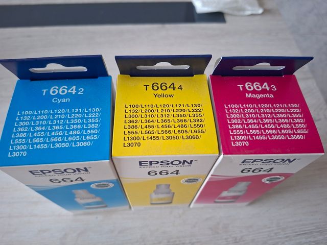 Recargas de tinta Epson modelo 664. - Capacidad de 70ml por botella. - Colores disponibles: Cyan, Yellow, Magenta.