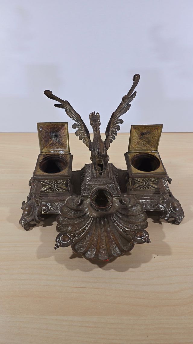 Tintero de hierro con un diseño Art Deco, una pieza que destaca por su estilo vintage y su elegancia. Ideal para quienes disfrutan del estilo clásico y sofisticado.