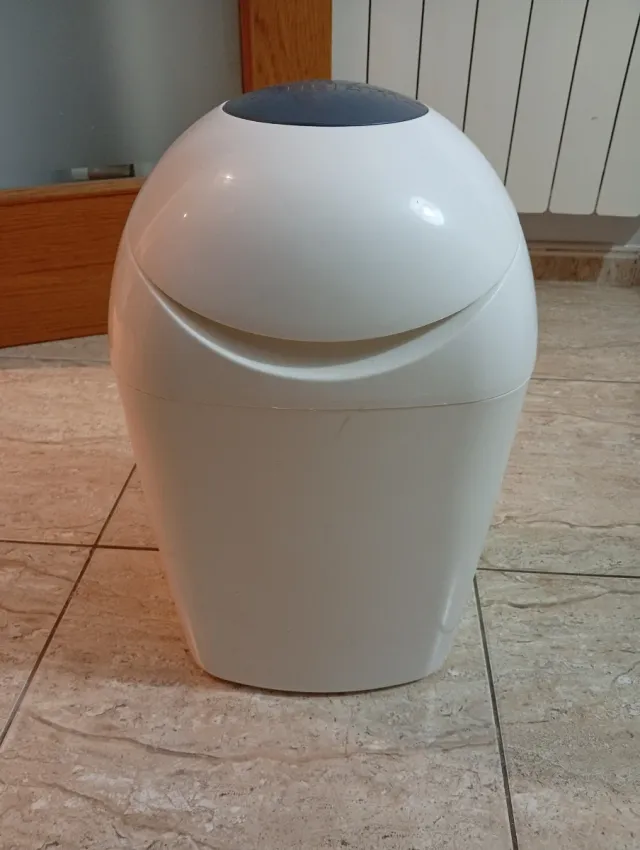 Cubo para pañales Tippe, diseñado para mantener los olores a raya. Su forma es redondeada y elegante. - Color blanco. - Tapa superior gris. - Diseño curvo.
