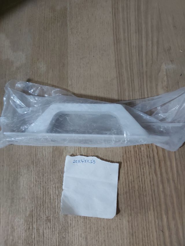 Tirador acabado rectangular de aluminio blanco, medidas 20x4,5x2,5 cm, en su bolsa, sin abrir. El precio nuevo son 7,99 euros.