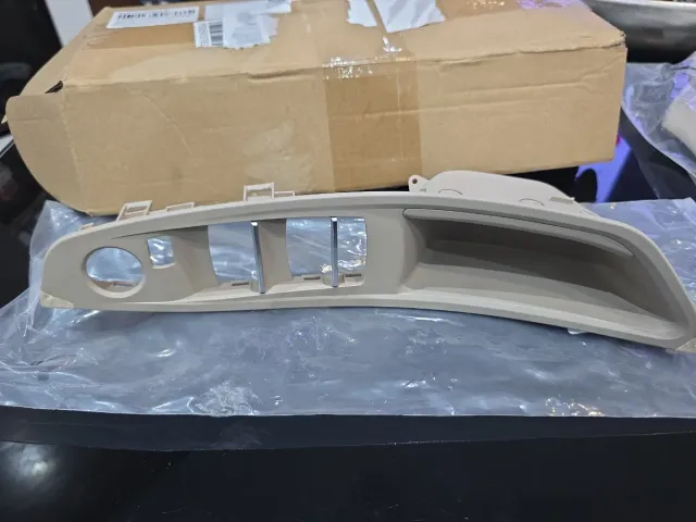 Pieza de interior para BMW, con un acabado en color beige. 3 piezas - Diseño curvo y elegante. - Aberturas para diferentes componentes.