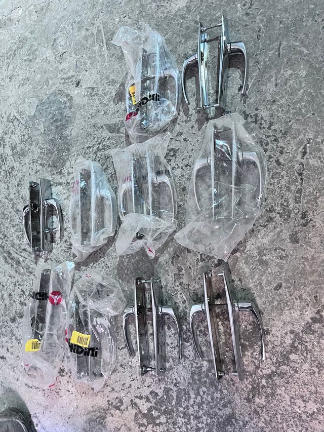 Conjunto de tiradores de puerta de estilo antiguo. Son de metal y tienen un acabado plateado. - Diseño clásico. - Ideales para restauraciones.