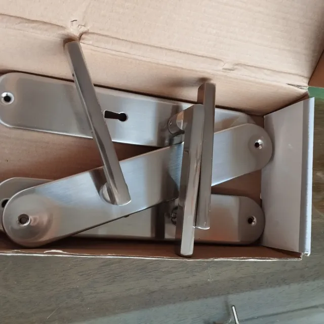 Set de 5 tiradores de puerta de metal, sin usar. - Acabado plateado cepillado. - Diseño moderno y elegante.