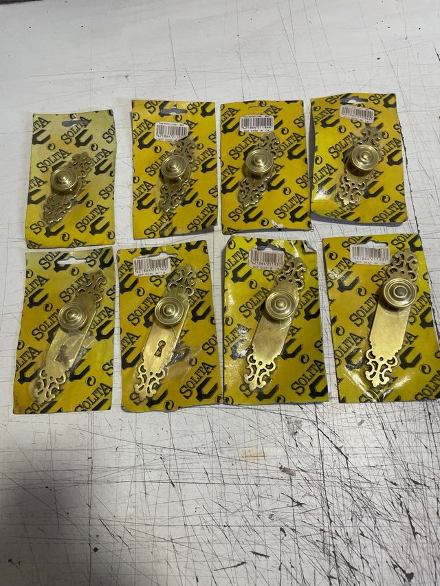 Detalles del productoJuego de ocho tiradores de latón para puertas. Son de estilo antiguo, con un diseño elegante y ornamentado. Ideales para dar un toque clásico a cualquier puerta.