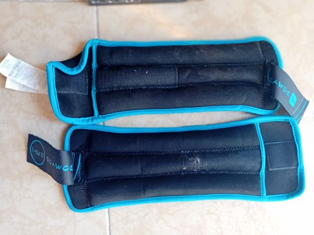 Par de tobilleras lastradas de la marca DOMYOS. - Color: negro con ribete azul. - Peso: 0.75 kg cada una. - Cierre de velcro ajustable.