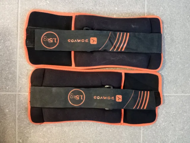 Par de tobilleras de lastre de la marca DOMYOS. - Cada tobillera pesa 1.5kg. - Color negro con detalles naranjas. - Cierre de velcro ajustable.
