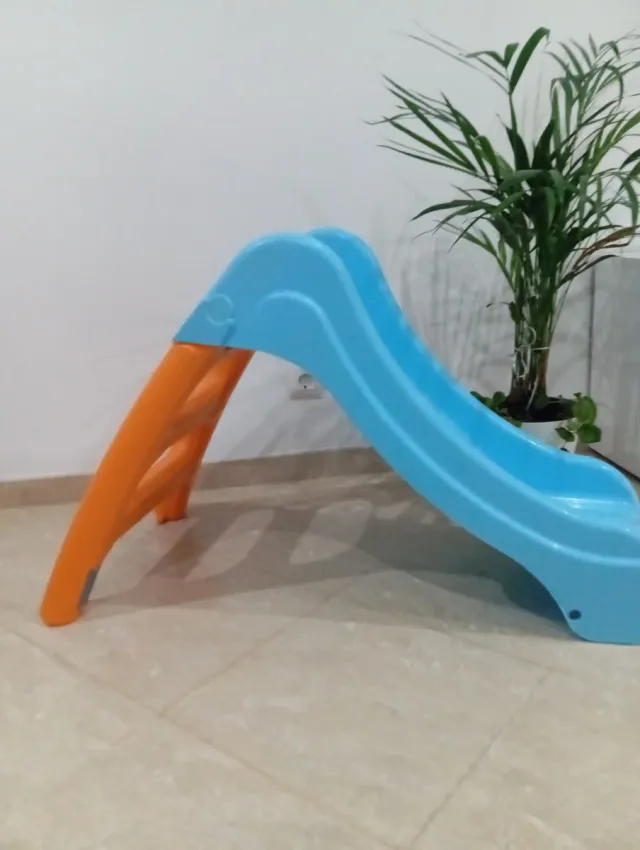 Tobogán de plástico para niños, con un diseño divertido y seguro. - Estructura de plástico resistente. - Colores azul y naranja. No se hacen envíos