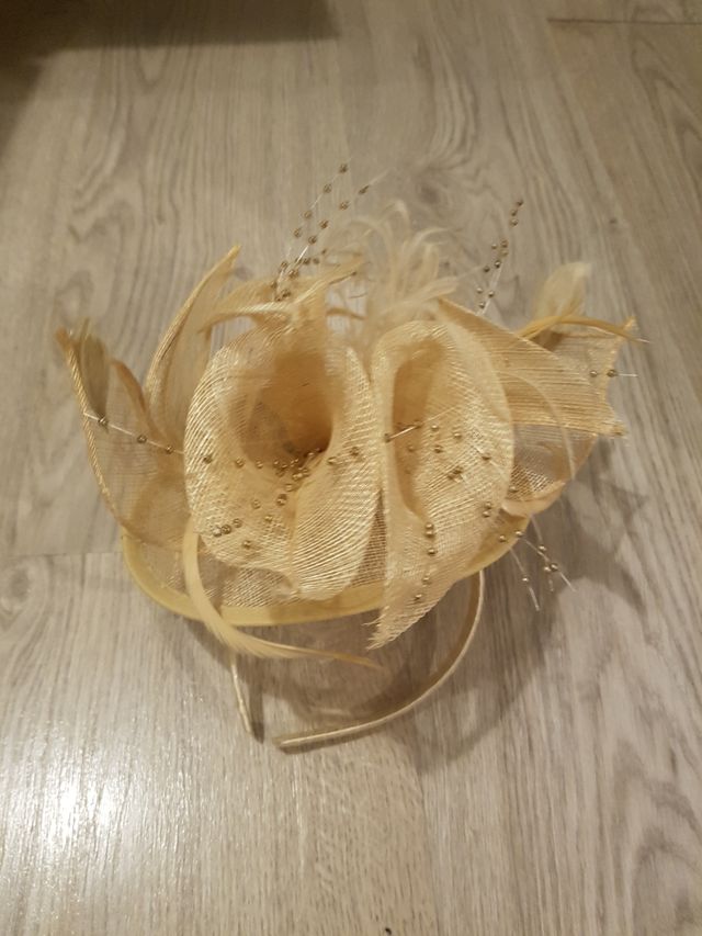 Tocado con diadema en beis con un toque de azul, se puede quitar la cinta y poner a juego con el vestido que se lleve