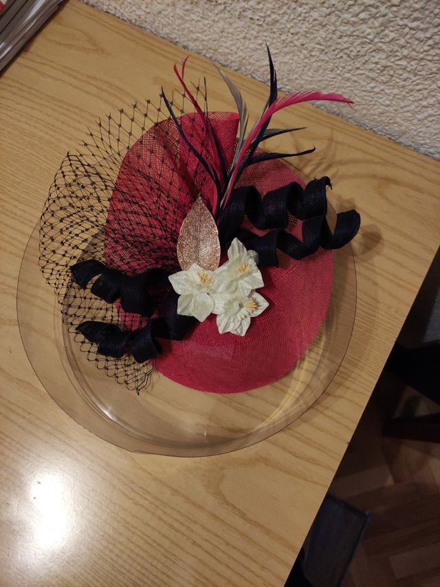 tocado de pelo con base en fucsia adornos en azul y flores blancas y hoja dorada en prefecto estado solo puesto 1 hora aproximadamente 20x25