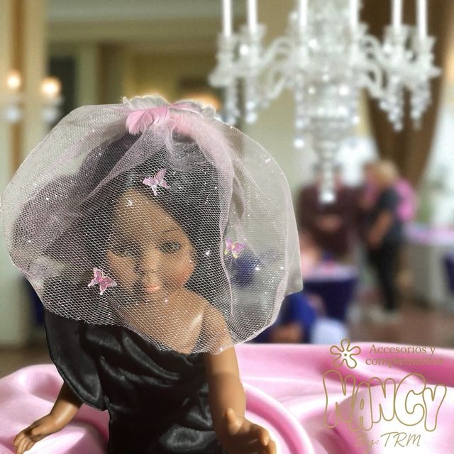 Tocado Nancy Tul Rosa con Plumas y Mariposas